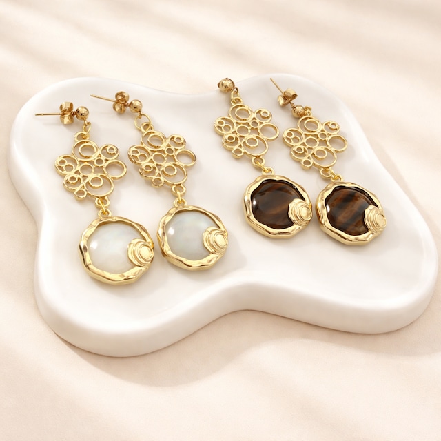 − 華やかさと上品さを兼ね備えた大人のゴールドピアス − 繊細なサークルモチーフと、樹脂パーツを組み合わせた存在感のあるピアス。 ゴールドの華やかな輝きにやわらかなブラウンやホワイトのカラーが組み合わさり、上品で女性らしい印象を演出します。 程よいボリューム感がありながら、透かしデザインで軽やかな雰囲気に。 普段のコーディネートにはもちろん、パーティーやお出かけなど特別なシーンにもぴったりです。 カラーは ・やさしく上品な印象のホワイト ・落ち着いた大人の雰囲気のブラウン の2種類をご用意。 動くたびに揺れるデザインが、顔まわりを華やかに彩ります。 ※ハンドメイド作品のため1点ごとに形や色合い、風合いが違いますが、ご指定いただくことはできかねますのでご了承ください。 ※ドライフラワーを使用した商品は、経年変化によりお花の色に変化が出る場合があります。 【サイズ】 FREE 【発送目安】 ご入金確認後、3日以内