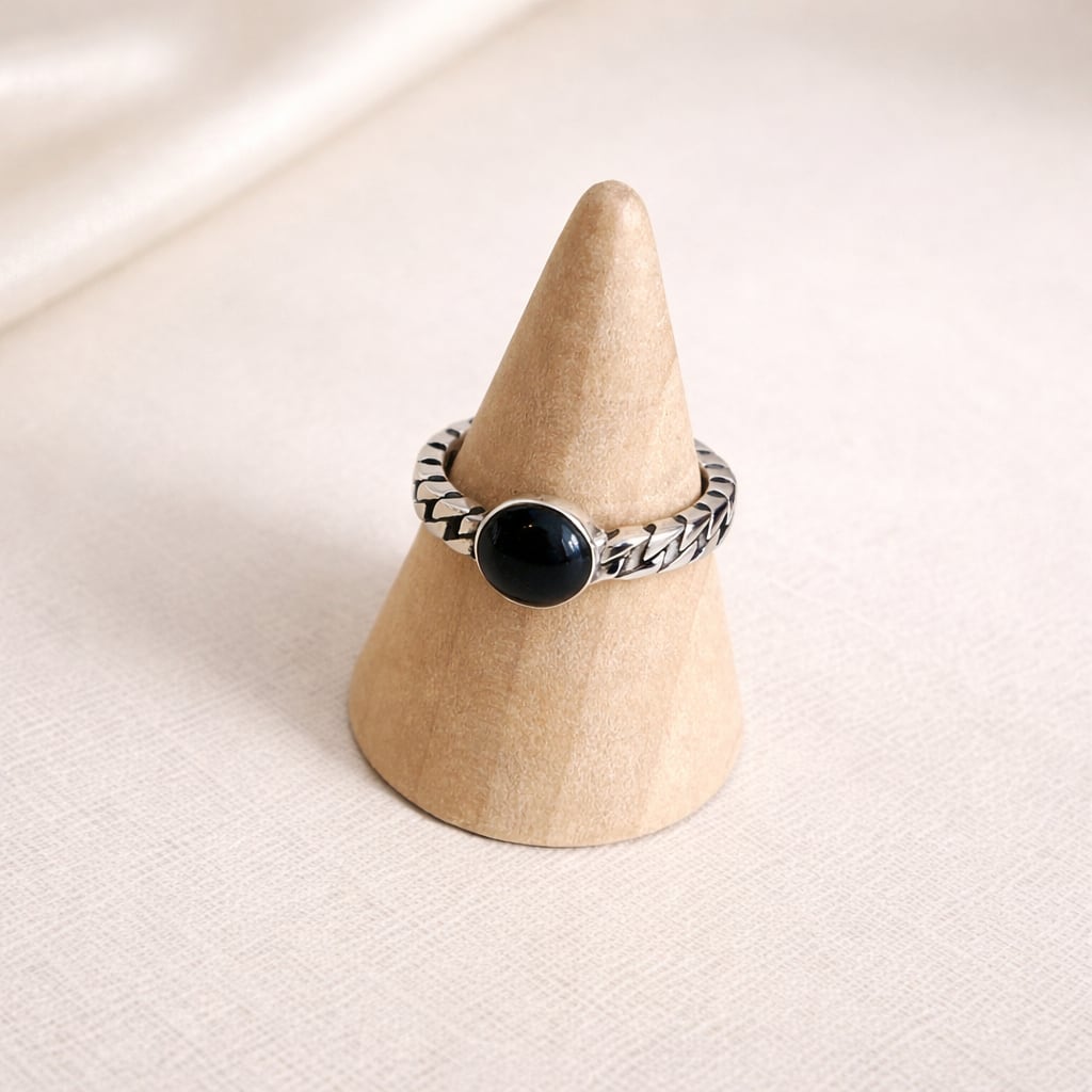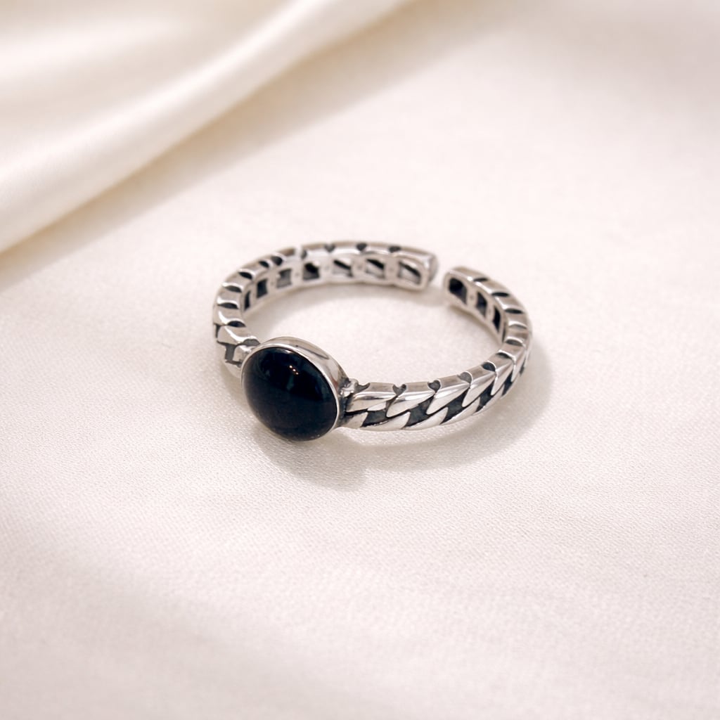 シンプルでありながらもダークな輝きのブラックストーンが存在感を放ち、指元を美しく彩ります。
