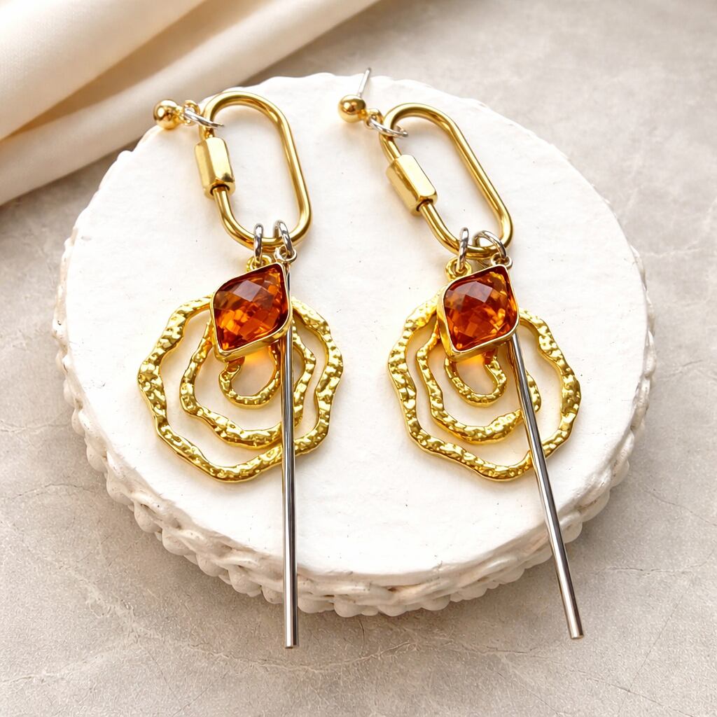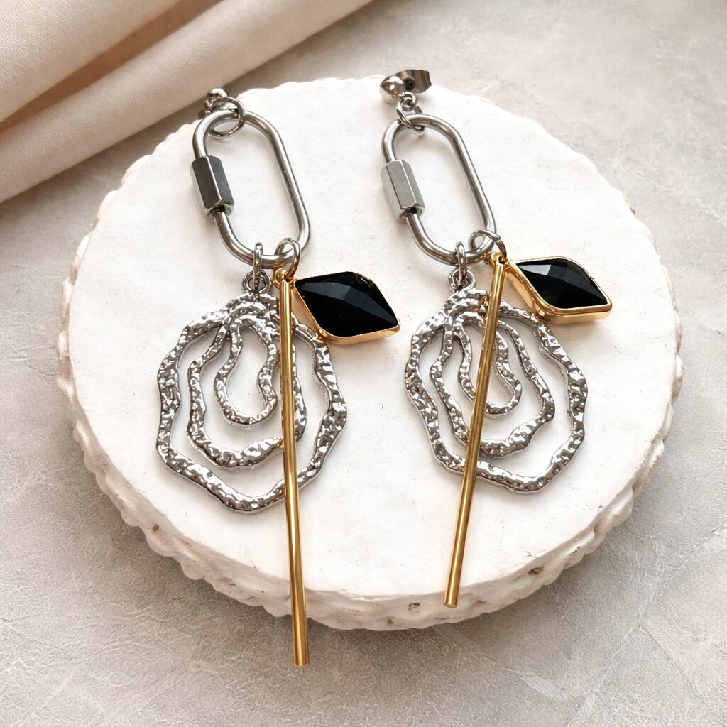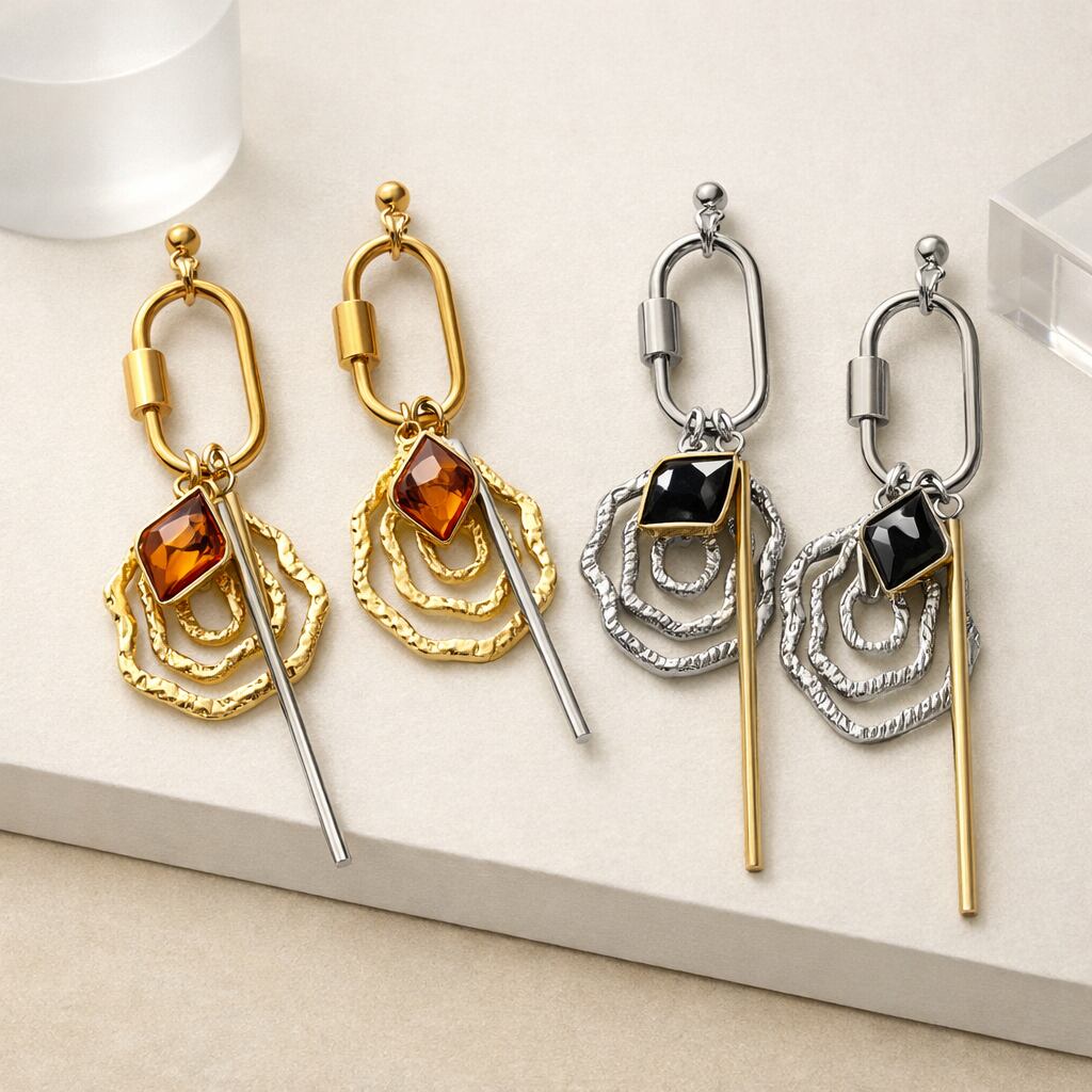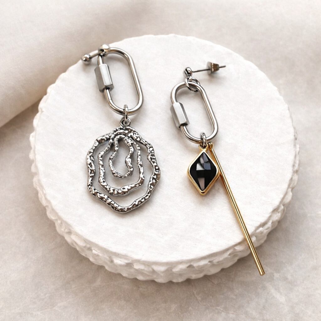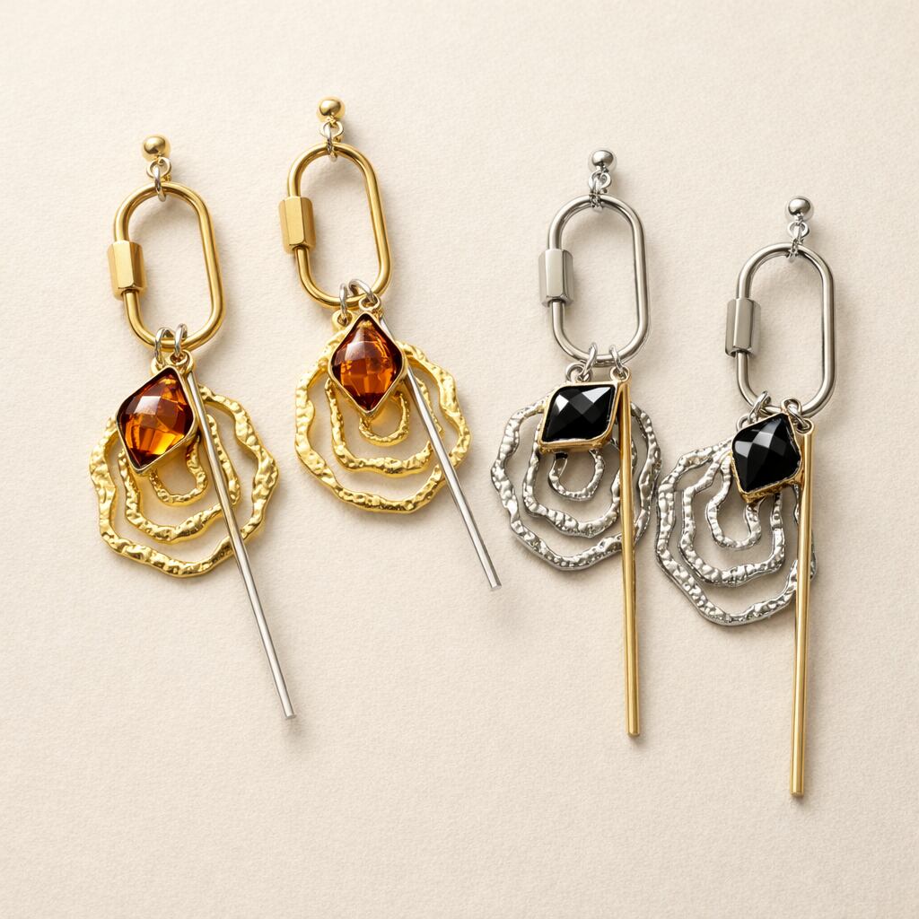 カラビナのデザインが耳元で存在感を放ち、おしゃれのアクセントとしてファッションに遊び心をプラスしてくれる1点。