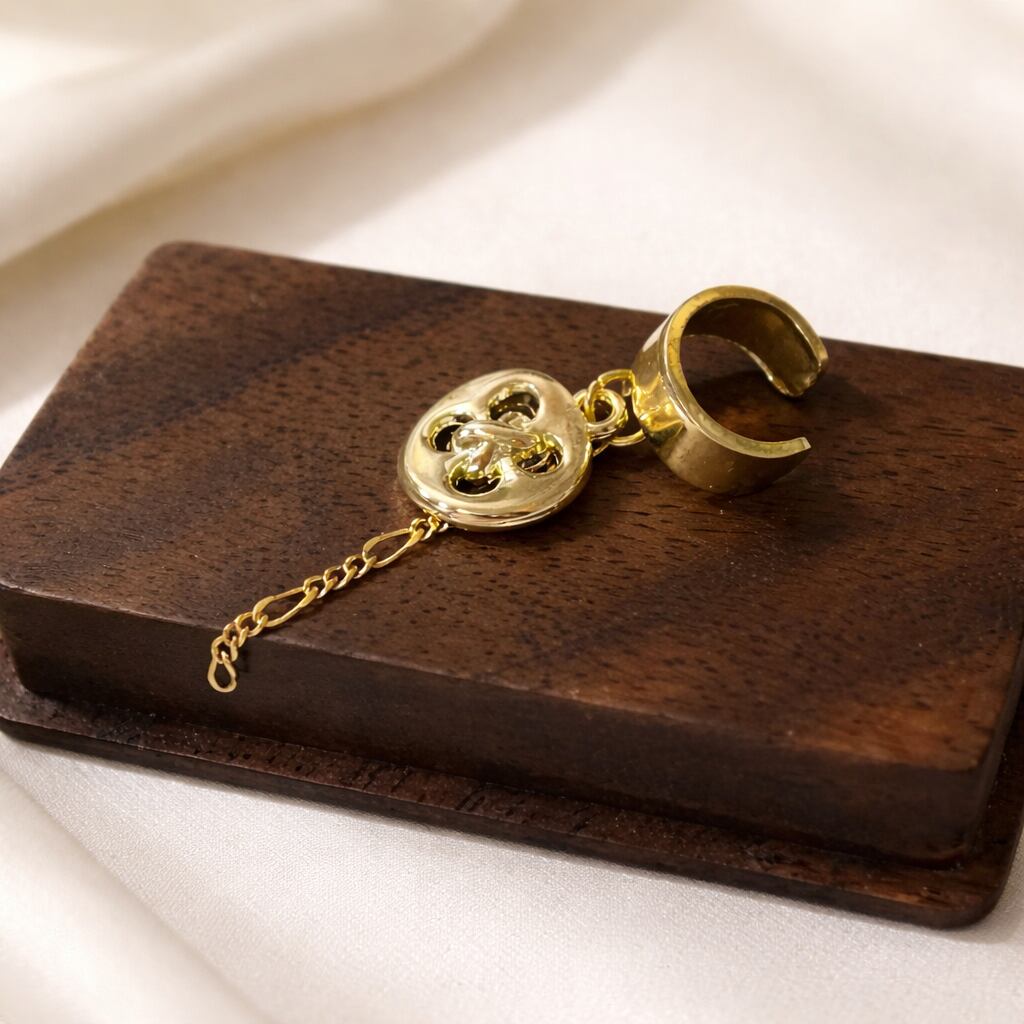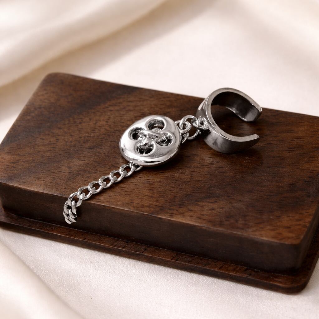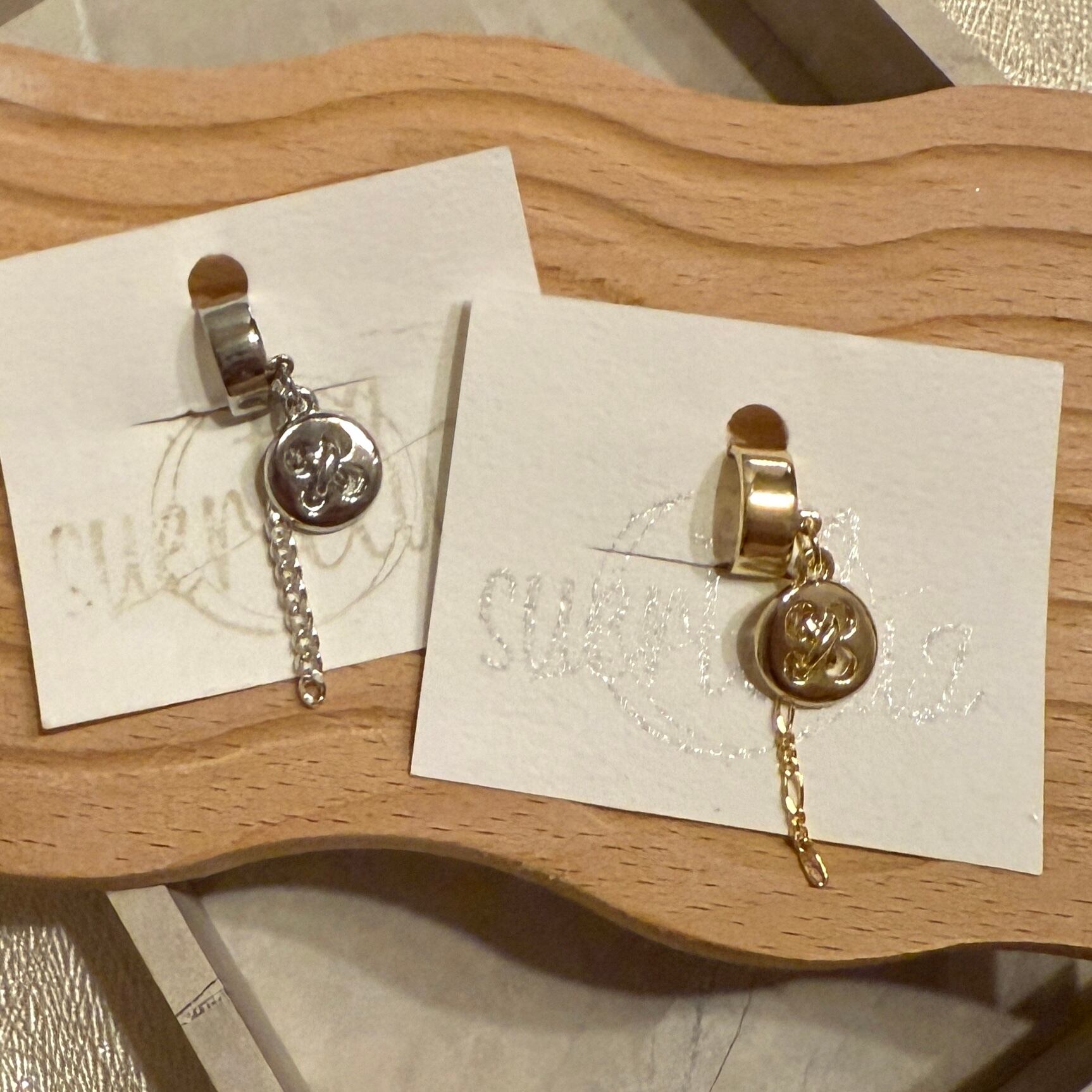 ボタンチャームをあしらったイヤーカフは、耳元にさりげない遊び心と可愛らしさを加えてくれます。