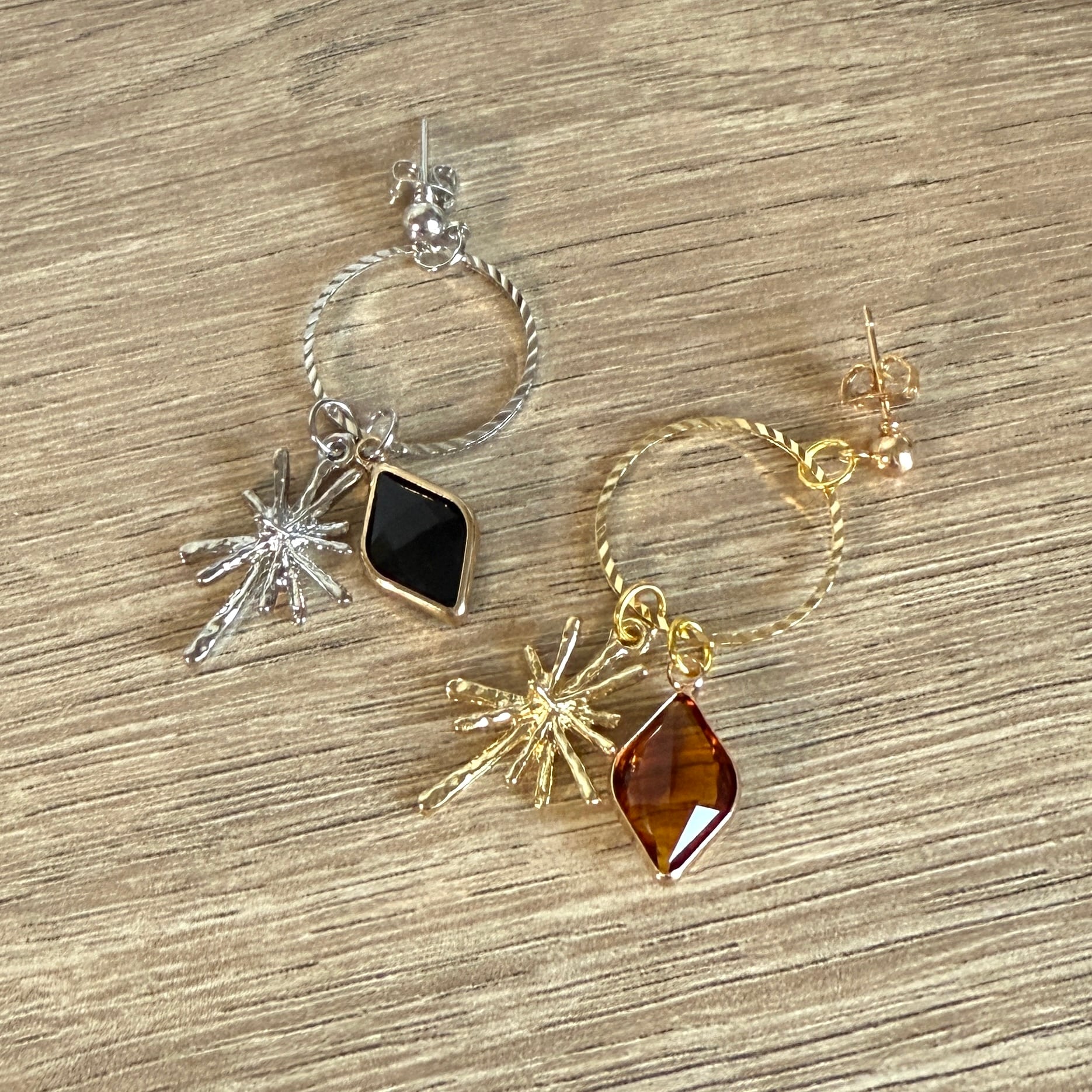 耳元に華やかな印象を与えてくれる花芯とダイヤパーツを組み合わせたラウンドピアス。