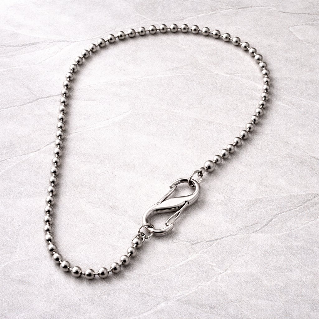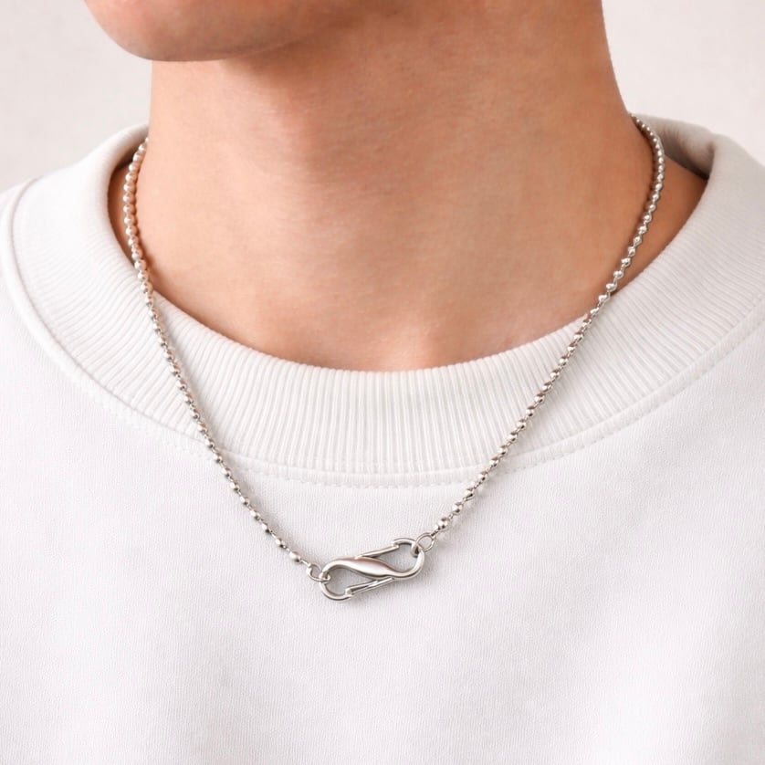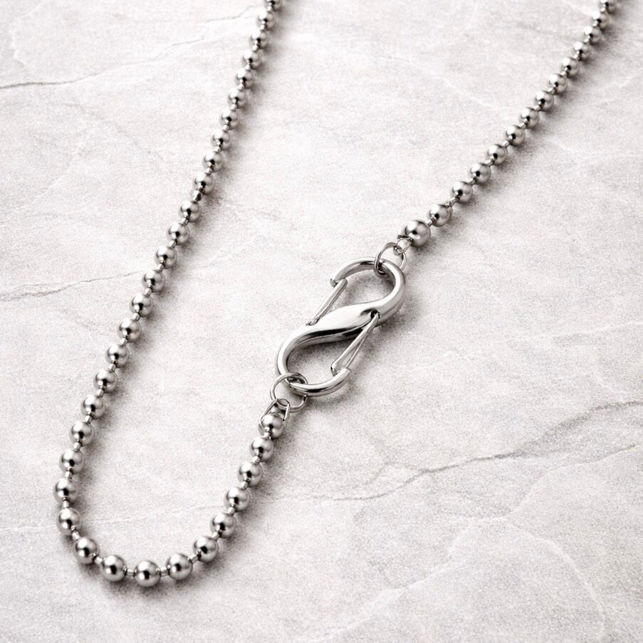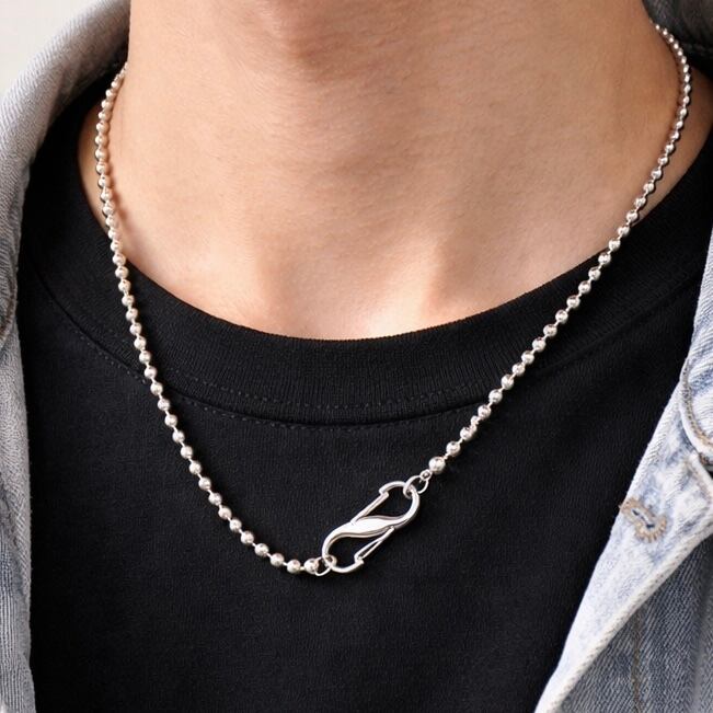 シンプルなボールチェーンに、存在感のあるカラビナを組み合わせたデザインネックレス。