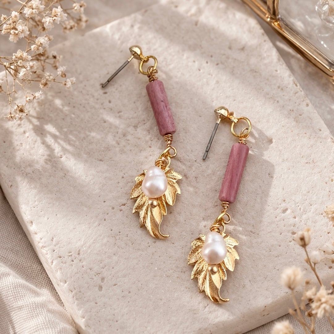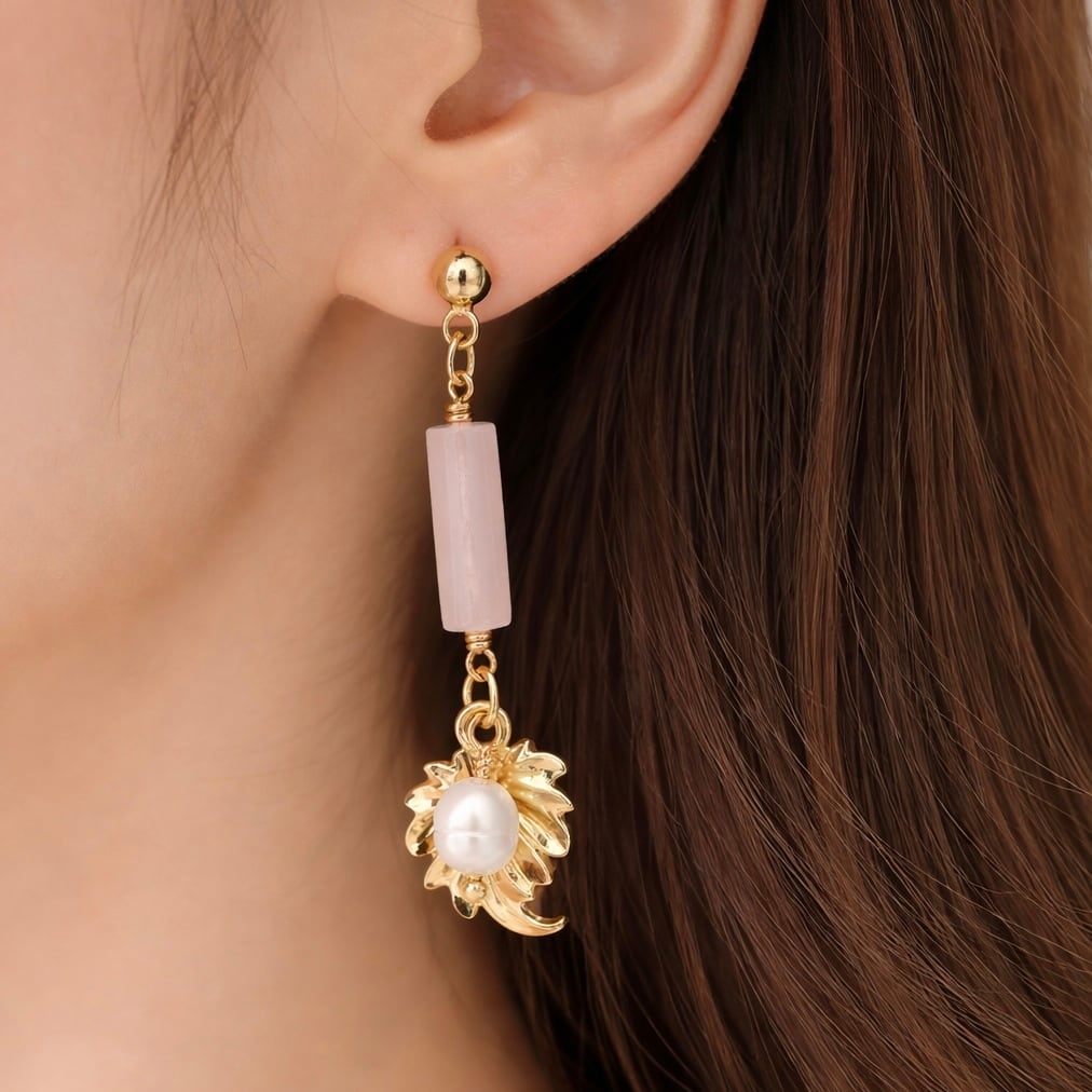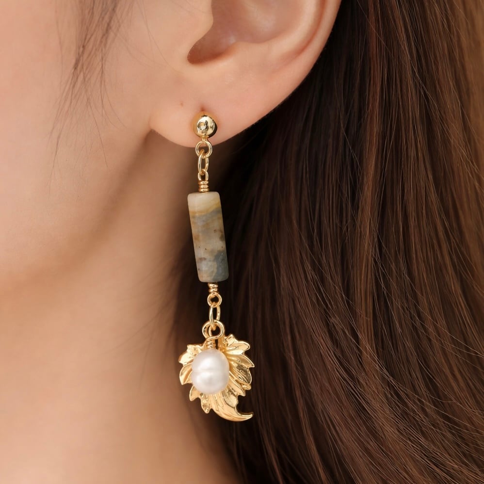 耳元でやさしく揺れる、天然石風チャームと淡水パールを組み合わせた上品ピアス。