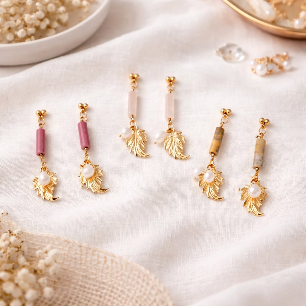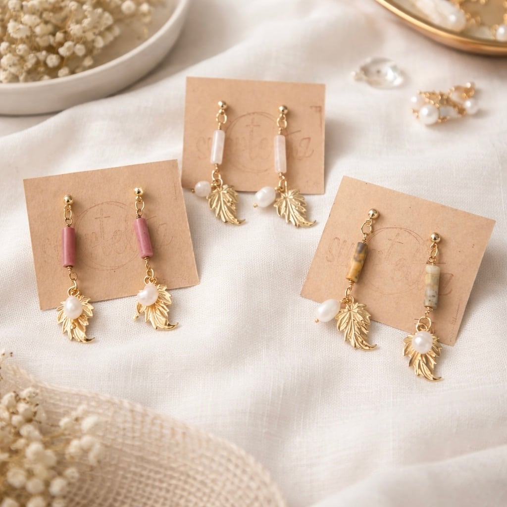 ナチュラルな風合いのストーンチャームに艶のあるパールとゴールドリーフをプラスすることで、華やかさと落ち着きを兼ね備えたデザインに仕上げました。