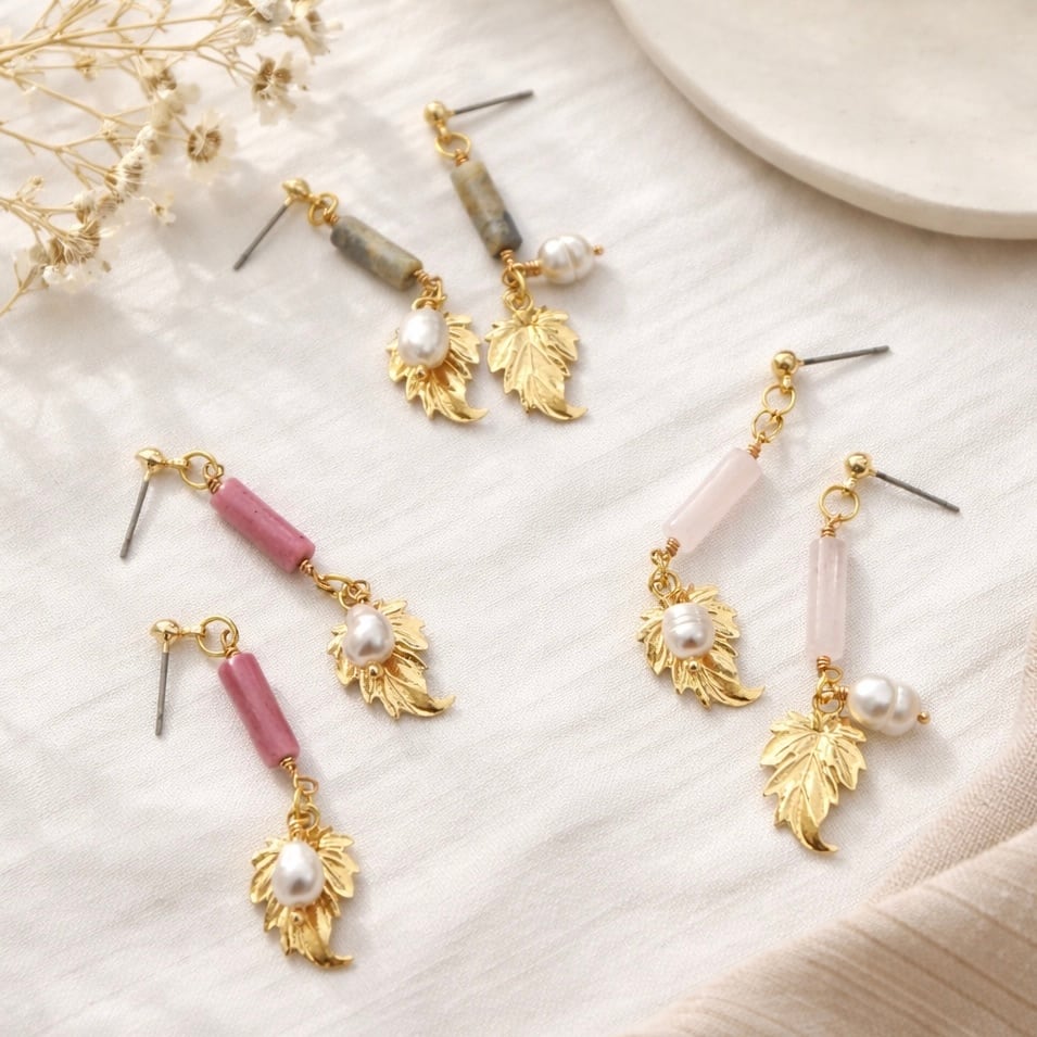 − フェイクストーン×パール×リーフで魅せる、上品ピアス −