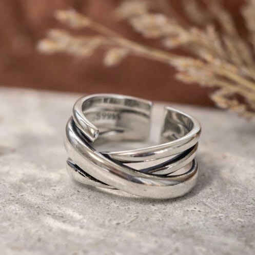 流れるような多重のラインを繋ぎ合わせて作られたクロスデザインのシルバーリング。